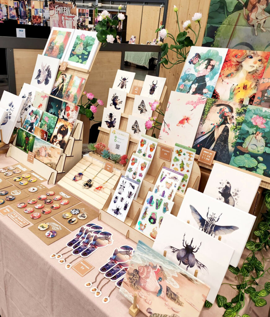 Sur son stand vous trouverez des prints de divers formats, des stickers et des petits goodies tels que badges et porte-clés.
